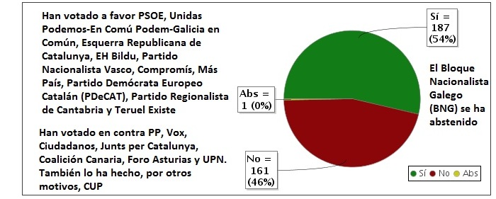 El Gobierno ha conseguido los votos suficientes como para convalidar el RDL 14 (de medidas de ahorro, eficiencia energética y de reducción de la dependencia energética del gas natural). Pese a la avalancha mediática que durante los últimos días venía anunciando dificultades poco menos que insuperables para que el Ejecutivo lograse los apoyos suficientes, lo cierto es que, finalmente, hasta 187 diputados de diez partidos políticos distintos (holgada mayoría absoluta pues) han dado luz verde a la propuesta del bipartito PSOE-Unidas Podemos. El sí lo han pronunciado PSOE, Unidas Podemos-En Común Podem-Galicia en Común, Esquerra Republicana de Catalunya, el Partido Nacionalista Vasco, EH-Bildu, el PDeCAT, Más País-Equo, Compromís, Teruel Existe y el Partido Regionalista de Cantabria. Frente a ellos, todas las derechas (PP, Vox, Ciudadanos, Unión del Pueblo Navarro, Foro Asturias y Junts) y la CUP.