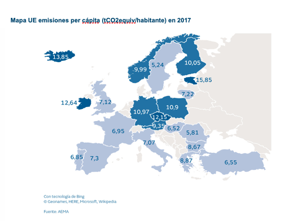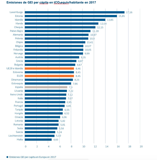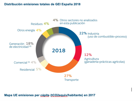 Desde el inicio de la aplicación del mercado de derechos de CO2 en 2005 y hasta 2018, España registró una reducción del 25% de las emisiones de GEI, 5 puntos por encima de la media europea, y del 30% de las emisiones per cápita. Según el informe, un 80% de las emisiones GEI corresponde a CO2.