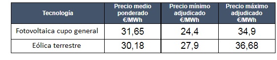 Se trata de una subasta pay as bid, es decir, los promotores pujan por el precio que están dispuestos a cobrar por la energía que generen en sus plantas y ese es el precio que se les asigna durante 12 años. Atendiendo a la media ponderada del volumen de potencia adjudicado a los distintos precios, los precios resultantes para cada tecnología han sido los que recoge la tabla adyacente.