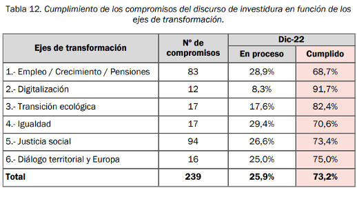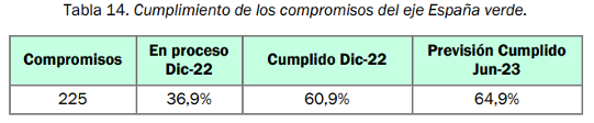 La transición ecológica fue uno de los seis compromisos de legislatura, que alcanza al terminar diciembre el 82,4% cumplido. También lo fue del Plan de Recuperación, Transformación y Resiliencia con 225 compromisos de los cuales el 60,9% está cumplido, el 36,9% en proceso, y la previsión para el primer semestre del 2023 es cumplir el 64,9%.