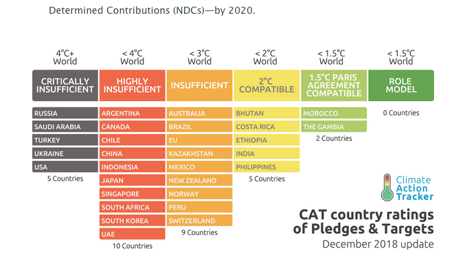 En la mayoría de los otros 32 países analizados en su informe, el CAT ha detectado también un movimiento positivo real, si bien ninguno de ellos ha alineado aún completamente sus políticas con el Acuerdo de París. El informe indica que Noruega y Costa Rica, por ejemplo, están avanzando en la descarbonización del transporte y el uso de energías renovables, pero otros corren el riesgo de perder su posición de liderazgo climático, como China, donde el uso del carbón volvió a aumentar en 2018 por segundo año consecutivo.