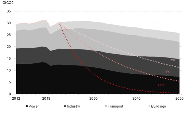 Emisiones en el Escenario de Transición Económica del NEO, por sector, y un presupuesto de carbono de 1,75°C