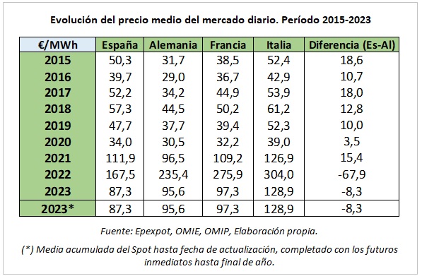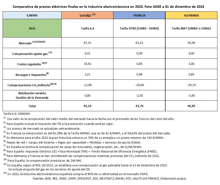 Según la asociación que defiende los intereses de las empresas electrointensivas, aunque el precio medio de la electricidad en el mercado diario español es menor que en sus homólogos francés, italiano o alemán, lo cierto es que "la gran industria de Francia y Alemania compra su electricidad con contratos más competitivos". En el caso francés, por ejemplo, el marco regulatorio impulsado dedes el estado desde hace décadas hace posible que la electricidad que adquieren las empresas electrointensivas sea más barata que en España. En ese caso las diferencias son además muy considerables. Mientras que Francia cuenta con una compañía eléctrica pública, muy potente además, cien por cien propiedad del estado galo, en España la gran compañía eléctrica estatal, Endesa (Empresa Nacional de Electricidad, SA) fue privatizada a principios de este siglo y ahora mismo el país no cuenta con ninguna eléctrica estatal. [Véase, bajo estas líneas, tabla comparativa de precios eléctricos finales en la industria electrointensiva. Junio de 2023. AEGE].