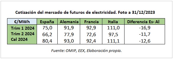 • La cotización del futuro para 2024 del mercado eléctrico español a 31 de diciembre ha sido de 80,4€/MWh, un 11,1 % más barato que hace un mes, y un 13,55 % inferior a la cotización del mercado alemán.