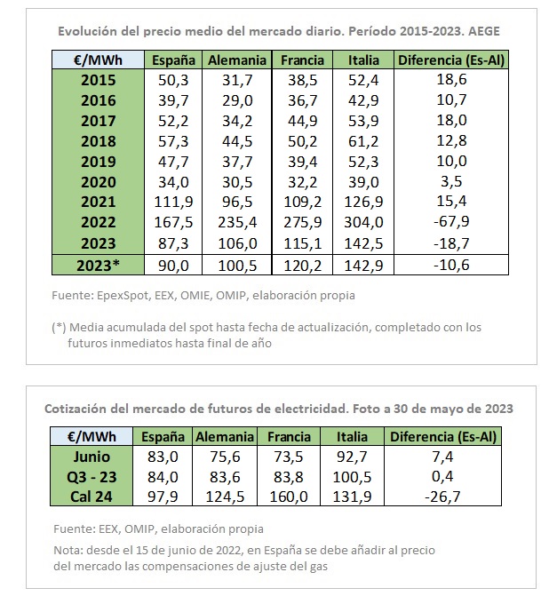 • Considerando la evolución del mercado diario en 2023 y las cotizaciones de los precios futuros hasta fin de año, el precio medio estimado del mercado eléctrico español rondará los noventa euros (89,95 €/MWh). Ese precio es un 46,2% menor que el de 2022 y se encuentra diez puntos por debajo del precio que se espera en el mercado alemán (-10,5%) y veinticinco por debajo del francés (-25,2%). La Asociación advierte en todo caso que "la gran industria de Francia y Alemania compra su electricidad con contratos más competitivos que el precio de sus mercados eléctricos". Así, en Francia -señala AEGE- disfrutan de la tarifa ARENH, a 42€/MWh, muy por debajo de los 74,21 del precio registrado en España en mayo.
