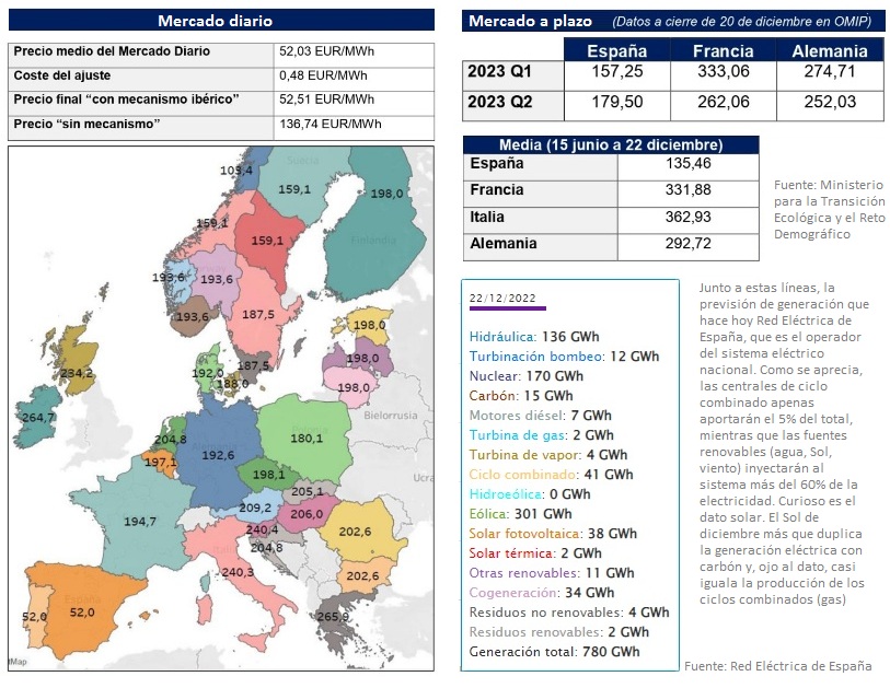 Hoy el precio de la electricidad de 12 de las 24 horas del día no alcanza siquiera los 50 euros. Las horas más baratas han sonado de madrugada. Además, entre las 13.00 y las 17.00 horas la electricidad volverá a estar muy por debajo de los 50 (horas para la lavadora y el lavavajillas). Así las cosas, este 22 de diciembre se ha convertido en el día en que más barata ha salido la electricidad del mercado mayorista ibérico en todo el curso: el más barato del año (véase gráfico a pie de página). Según las previsiones de Red Eléctrica de España, que es el operador del sistema eléctrico nacional, las centrales de ciclo combinado (que queman gas natural para generar electricidad) apenas van a aportar hoy el 5% del total de la demanda de electricidad. En el otro plato de la balanza están las energías renovables, que generarán a lo largo de la jornada de hoy casi dos de cada tres kilovatios hora. Nuclear, carbón y las otras fuentes sucias de electricidad (residuos no renovables, motores diésel, etcétera) producirán el 30,2% de la electricidad.