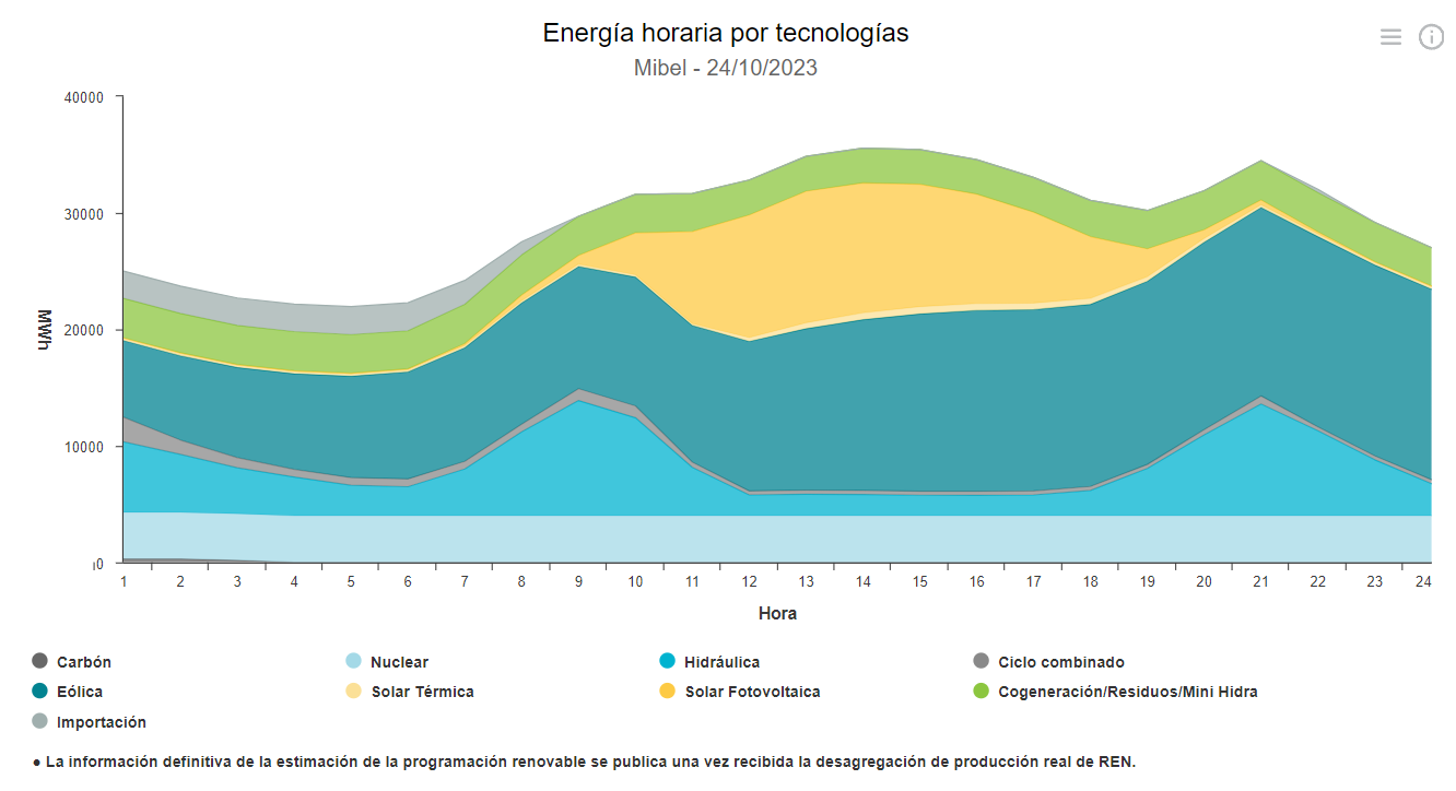 En lo que va de octubre, la media del mercado eléctrico se sitúa en los 103,66 euros/MWh, frente a los 127,21 euros/MWh que registró el 'pool' en el mismo mes de 2022.