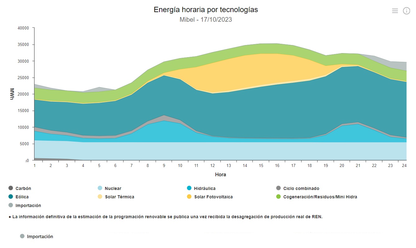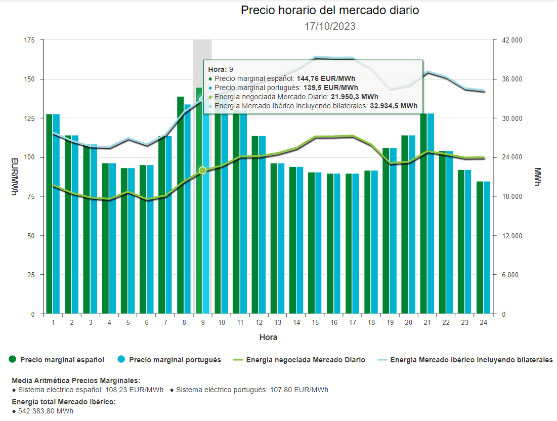 Por franjas horarias, el precio máximo, de 144,76 euros/MWh, se registrará entre las 08.00 y 09.00 horas, mientras que el precio mínimo se dará entre las 23.00 y las 24.00 horas, con 84,78 euros/MWh, según los datos provisionales del Operador del Mercado Ibérico de Energía (OMIE). En lo que va de octubre, la media del mercado eléctrico se sitúa en torno a los 115,2 euros/MWh, frente a los 127,21 euros/MWh que registró el 'pool' en el mismo mes de 2022.