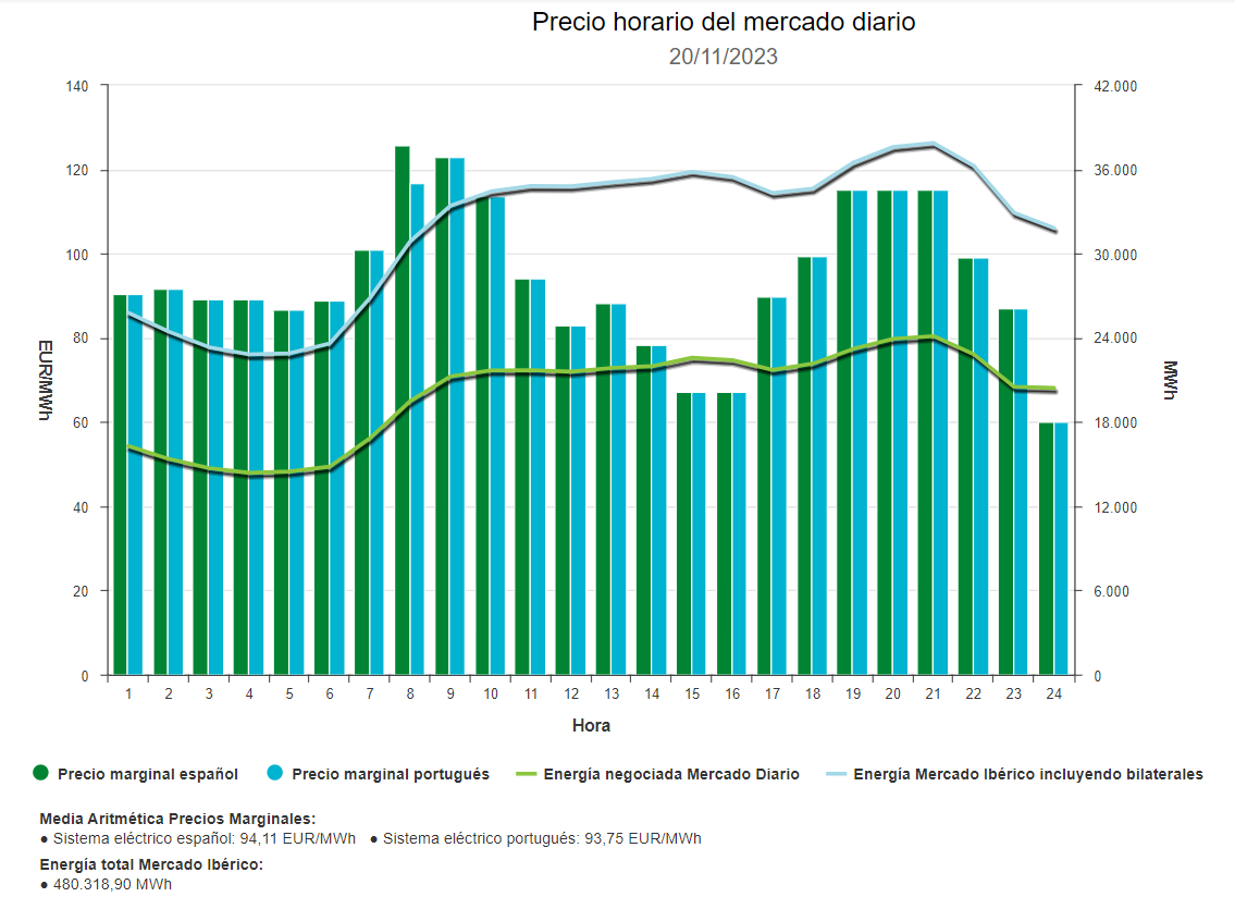El precio de la luz para este lunes es un 80% superior al del lunes pasado, 13 de noviembre, cuando se sitúo en 52,14 euros/Mwh, y se coloca en cifras similares a hace un año, cuando estaba en torno a los 90 euros/MWh. En lo que va de mes de noviembre, el 'pool' eléctrico registra un precio medio de algo más de 55 euros/MWh, frente a los 116 euros/MWh de media en el mismo mes del año pasado.