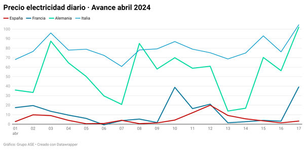 Los analistas del Grupo ASE señalan en su estudio que, hasta el día 17, el precio diario del mercado mayorista (POOL) español de abril se sitúa en 5,40 €/MWh, el mínimo desde que hay registros para un periodo tan prolongado. En cuanto a los precios negativos, durante 84 horas (20,6% del total) se han registrado precios negativos (entre 0 y -1 €/MWh) y el precio medio entre las 11:00 y las 17:00 horas ha sido de -0,08 €/MWh. También hubo otras 117 horas (28,7%) con precios "cero". Aunque los precios negativos son simbólicos, reflejan que hay tal exceso de oferta renovable que algunos generadores prefieren producir a desconectarse, para evitar los costes que ello puede implicar.