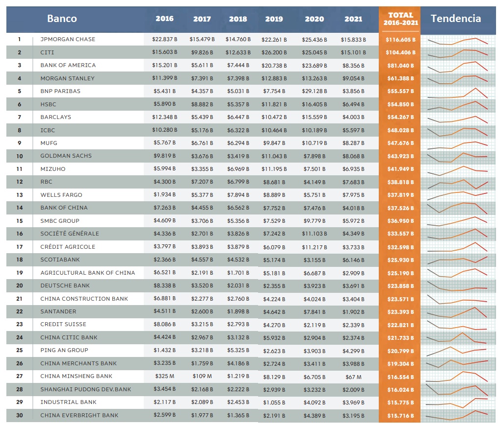 El informe vuelve a señalar cómo los proyectosde combustibles fósiles y los bancos que los apoyan son incompatibles con los compromisos climáticos. Por eso, el texto incluye diferentes demandas a los bancos para que dejen de financiar esta industria, tales como: