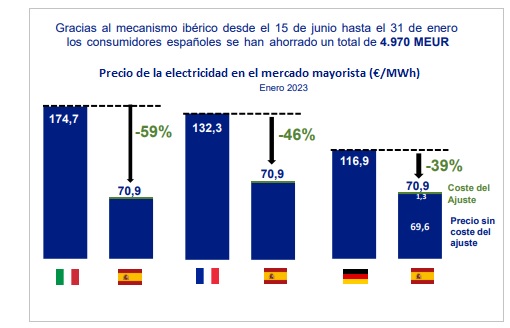 La ministra para la Transición Ecológica y el Reto Demográfico en todo caso ha destacado singularmente la denominada Solución Ibérica, que ha proporcionado un ahorro en el mercado mayorista de la electricidad de 4.970 millones de euros hasta el pasado 31 de enero. Durante el mes de enero en España los precios mayoristas han sido casi sesenta puntos más bajos que en Italia (-59%), un 46% más bajos que en la vecina Francia y casi cuarenta puntos porcentuales (-39%) más bajos que en Italia, incluyendo el coste del ajuste que perciben las centrales de gas.