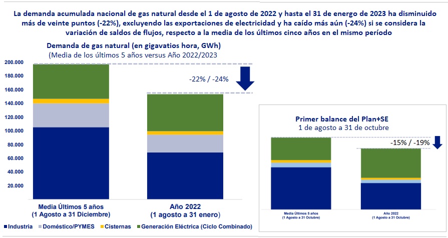 Economía de guerra y tiempos de ahorro. España ha reducido su demanda de gas natural más de veinte puntos (-22%) desde el pasado mes de agosto y hasta el 31 de enero, en comparación con el nivel de consumo del mismo período en los últimos cinco años; considerando el saldo importador del quinquenio, la reducción de la demanda interna supera incluso ese porcentaje (-24%). Es uno de los datos clave hechos públicos ayer en el informe de seguimiento del Plan +Seguridad Energética, plan que aprobó el Gobierno el pasado mes de octubre con tres objetivos en el horizonte: (1) incrementar la protección a consumidores vulnerables, hogares, y empresas; (2) reforzar la autonomía estratégica y energética; y (3) reforzar la solidaridad con otros Estados Miembros, "incrementando las exportaciones de gas de forma directa o convertido en electricidad".