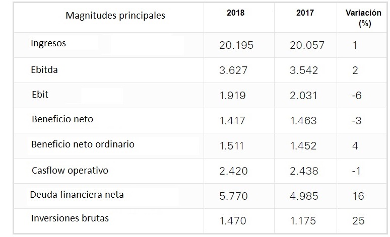 La deuda financiera neta ha aumentado en 785 millones de euros con respecto al 31 de diciembre de 2017 como consecuencia de varios factores, entre los que destacan las inversiones realizadas en el periodo, la adquisición de cinco parques eólicos de Gestinver, por 172 millones de euros (incluye consolidación de la deuda), la compra de la compañía distribuidora y comercializadora Eléctrica de Ceuta, por 83 millones de euros, y el pago de dividendos por importe de 1.472 millones de euros.