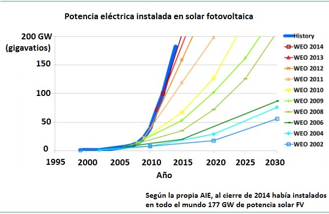 La red internacional de científicos y parlamentarios EWG ha vuelto a denunciar que las proyecciones de la Agencia Internacional de la Energía (AIE) no son realistas. Según esta organización no gubernamental, el informe World Energy Outlook 2015, que ha elaborado la AIE, "subestima una vez más, pronunciadamente, el potencial de la energía solar fotovoltaica y el de la energía eólica, a la par que enfatiza las fuentes energéticas convencionales".