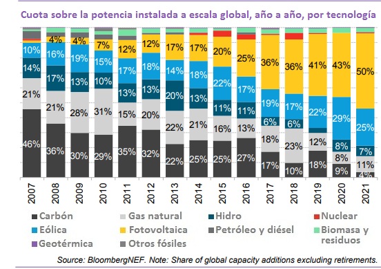 Cada año, desde 2017, las industrias eólica y fotovoltaica ganan la partida de nueva potencia instalada. 2021 además ha fijado un nuevo máximo: el 75% de los 364 gigavatios de la nueva potencia de generación de electricidad instalada en el mundo (tres cuartas partes) ha sido eólica o fotovoltaica. Si incluimos en ese bloque a la nuclear y la hidráulica, que no emiten CO2, tendríamos que el 85% de la nueva capacidad es libre de ceodós.