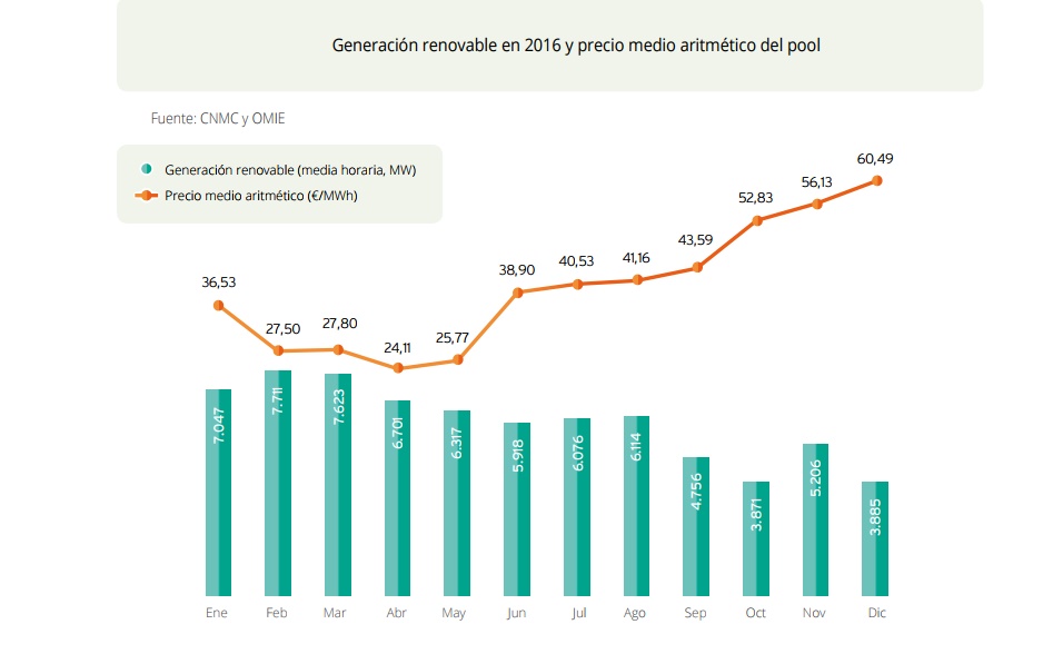 Y si el Ejecutivo Rajoy no hubiese congelado con sus recortes el desarrollo de la termosolar y la fotovoltaica, la chicharrera de julio y la solanera de agosto también nos ayudarían a bajarle los humos a los señores de la luz (además, en ese caso –sobre todo en verano- la producción se ajusta como anillo al dedo a la demanda: cuanto más calienta el Sol, más demanda hay de aire acondicionado; y cuanto mayor es la demanda de aire acondicionado –porque más calienta el Sol-, más electricidad de origen solar podemos generar). En fin, que APPA estima que, “si no hubiéramos tenido renovables en nuestro mix de generación eléctrica, el precio medio del mercado en 2016 habría sido de 61,17 euros el megavatio hora (€/MWh) en lugar de los 39,67 €/MWh”.