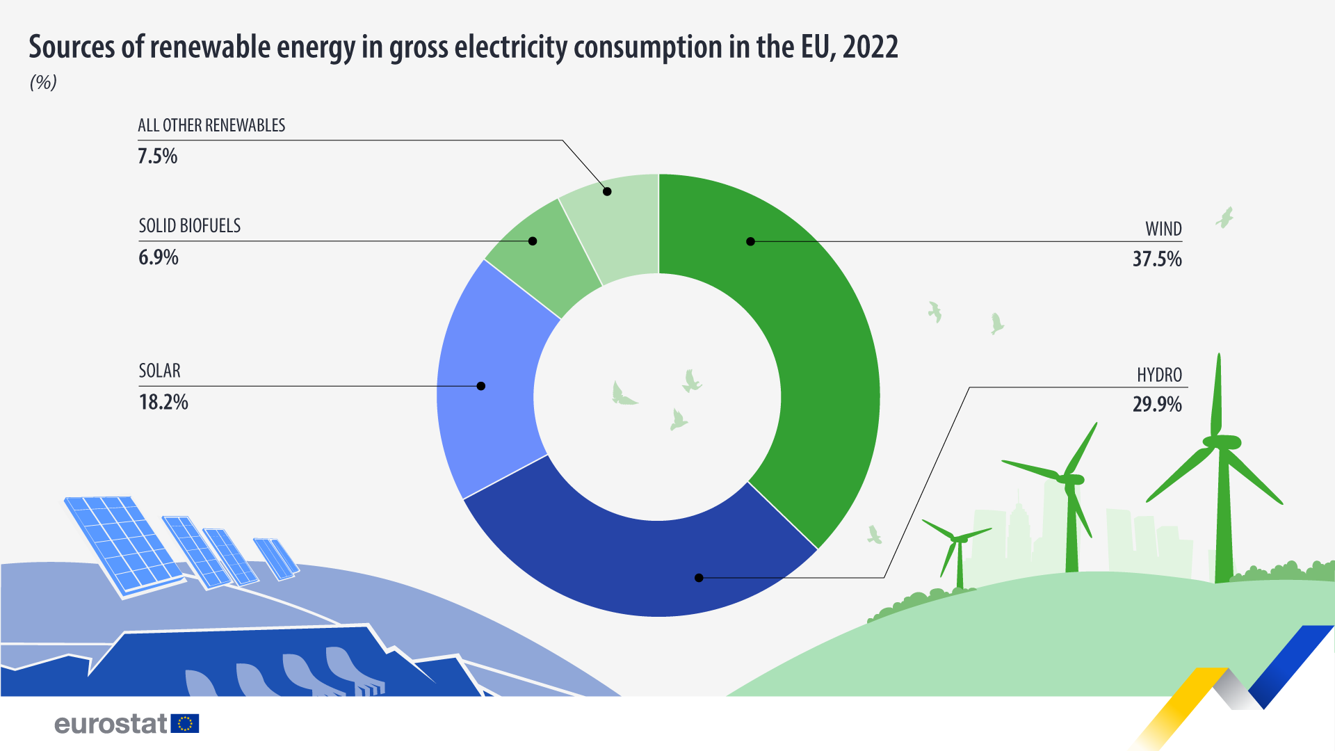 Los datos de Eurostat confirma que la energía solar es la fuente de más rápido crecimiento, ya que aunque en 2008 sólo representó el 1 % de la electricidad consumida en la UE, en 2022 su contribución representó el 18,2 %. Por energías, la eólica y la hidroeléctrica aportaron más de dos tercios de la electricidad total generada a partir de fuentes renovables (37,5 % y 29,9% , respectivamente), seguidas por los biocombustibles sólidos ( 6,9%) y otras fuentes renovables (7,5%).