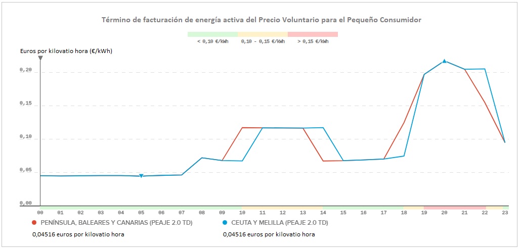 Para el día de hoy, el kilovatio hora que va a pagar el usuario que haya contratado PVPC (o sea, precio regulado por el Gobierno) oscila entre los 0,045 y los 0,21 céntimos. El precio del kilovatio hora de electricidad ofertado ahora mismo en el mercado libre por las comercializadoras que operan en España se encuentra grosso modo en la horquilla 0,15-0,35 céntimos, en función de muchas variables.