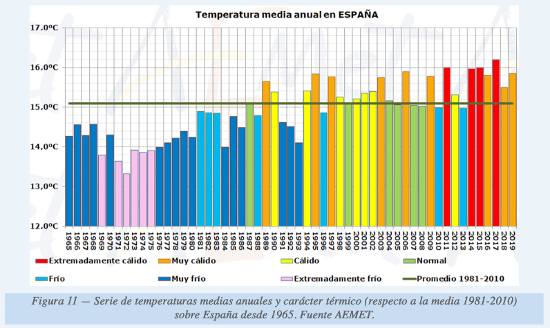 En 2019, año especialmente cálido, con 15,9ºC de temperatura media, 0.8ºC por encima del valor medio anual del periodo de referencia (1981- 2010) se registraron tres olas de calor de las que destaca, por su gran intensidad, la que tuvo lugar entre el 26 de junio y 1 de julio. En ella se superaron los 43ºC en puntos del nordeste peninsular y se batieron numerosos récords absolutos de temperatura máxima anual. Este hecho tiene pocos precedentes, pues la mayoría de las efemérides de temperatura máxima en España se habían producido hasta entonces en los meses de julio y agosto.