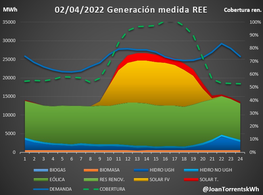 La voz de alerta la dio hace unas horas un joven ingeniero industrial catalán, Joan Torrents (ETSEIB-UPC), autor del gráfico que acompaña. Torrents adelanta que a esa hora en España también generaron electricidad las centrales nucleares y las térmicas de carbón, gas y la cogeneración, pero destaca que la producción renovable fue mayor que la demanda eléctrica total nacional, es decir, que fue suficiente como para atender el cien por cien de la demanda del país, una nación europea, industrializada, de más de 47 millones de habitantes. El fenómeno es extraordinario en todos los sentidos. Porque es -"que a mí me conste", apunta Torrents- la primera vez que ocurre, y porque cierto es que las circunstancias fueron muy concretas: sábado, tan soleado como ventoso, cuatro de la tarde. Más allá de ello, en todo caso, lo cierto es que la transición energética avanza en España a pasos agigantados.