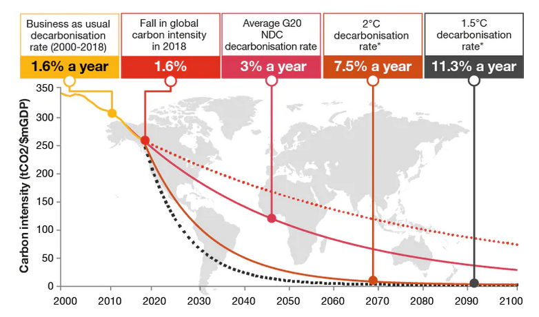 "Estimamos que la tasa media de descarbonización necesaria para cumplir con los objetivos nacionales para las economías del G20 es del 3% anual hasta 2030", indican desde PwC. A nivel mundial, el índice de descarbonización anual debería ser del 7,5% para tener una probabilidad de dos tercios de limitar el calentamiento a 2ºC.