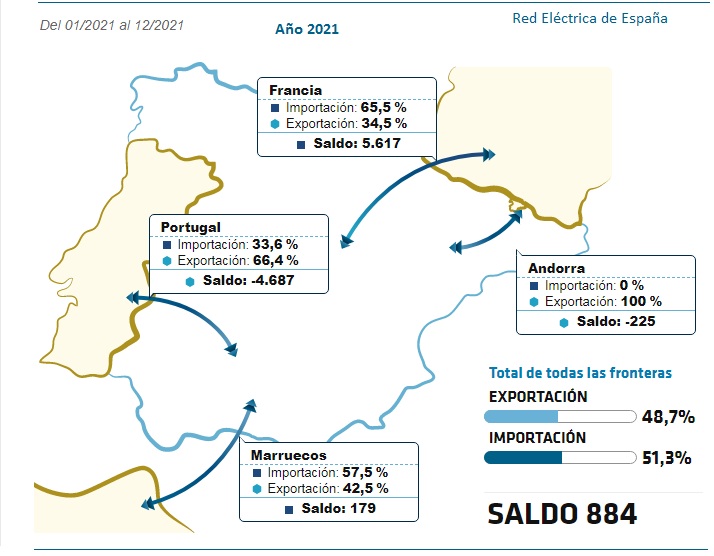Y, por fin, en cuanto a los intercambios internacionales, el mes de diciembre ha resultado netamente "exportador -señala REE en su Boletin-, con una energía equivalente a 1.324 gigavatios hora" (se suman ahí los gigas hora exportados a Francia, Andorra, Portugal y Marruecos; se les restan los importados; y se obtiene el saldo). En fin, que el saldo de España ha sido positivo en diciembre (hemos exportado más -1.324- de lo que hemos importado). En el acumulado anual, el resultado no es positivo. Hemos importado más electricidad que la que hemos enviado a otros países, pero el saldo anual resultante para 2021 es el mejor, con mucha diferencia, de los últimos cinco años homologables.