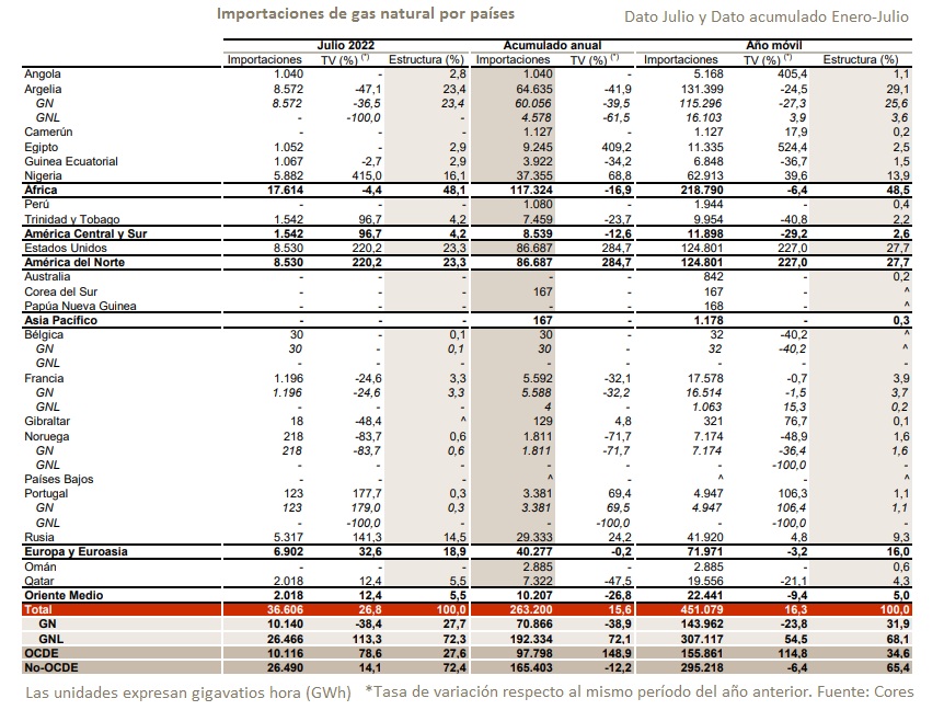 Asimismo, las compras de gas a Argelia se han reducido en un 41,17%. Esta caída se debe principalmente a la disminución de la llegada de gas natural por gasoducto, que pasó de los 111.758 GWh en los ocho primeros meses de 2021 a los 69.184 GWh hasta agosto de 2022, es decir, ha experimentado una reducción del 38%.