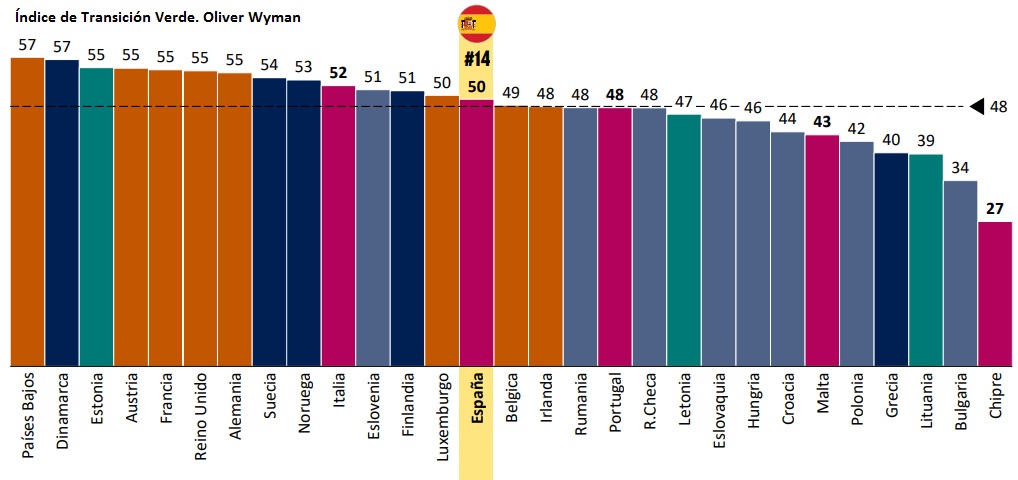Muchos huevos en la misma cesta. Mucha inversión -seis veces más que en la media de 29 naciones europeas- para alcanzar el Horizonte Hidrógeno (H2), ese que la propia administración (y muchos expertos en la materia) sitúan aún considerablemente lejos: la Hoja de Ruta del Gobierno de España dice que las tecnologías de hidrógeno renovable "deberían" alcanzar la madurez en torno al año 2030. Oliver Wyman ha elaborado el primer Índice de Transición Verde (ITV), un análisis de los avances de 29 países europeos -los pertenecientes a la UE, más Reino Unido y Noruega- en materia de sostenibilidad y reducción de emisiones. Y en ese índice (ITV) ha tenido en cuenta las siete "categorías clave" que considera representan "las principales fuentes de emisiones de la economía del continente". Así, el Índice examina y compara (1) el grado de sostenibilidad medioambiental del sistema económico de cada país; (2) su nivel de conservación de la naturaleza; (3) las emisiones de su industria manufacturera; (4) el avance en el uso de tecnologías de transición por parte de las energéticas; (5) la calidad medioambiental de su transporte; (6) la sostenibilidad de sus edificios y (7) el grado de circularidad en materia de gestión de residuos. Con un total de 28 indicadores clave divididos entre las siete categorías, el Índice otorga una puntuación a cada segmento y la agrega para conformar un escalafón con las 29 naciones analizadas, pudiendo comparar el rendimiento obtenido entre países o entre regiones europeas.
