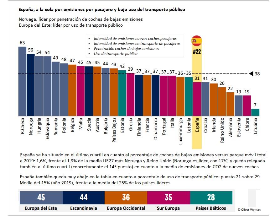 Estos datos -explican los autores del informe- revelan la necesidad de España de mejorar cualitativamente en áreas como (1) la circularidad de su economía, (2) la reducción de los residuos domésticos, (3) la penetración del transporte público (15% de España versus 25% de los países líderes) o (4) la expansión de los vehículos eléctricos o híbridos para reducir la intensidad de emisiones por pasajero (puesto 23 sobre 29).