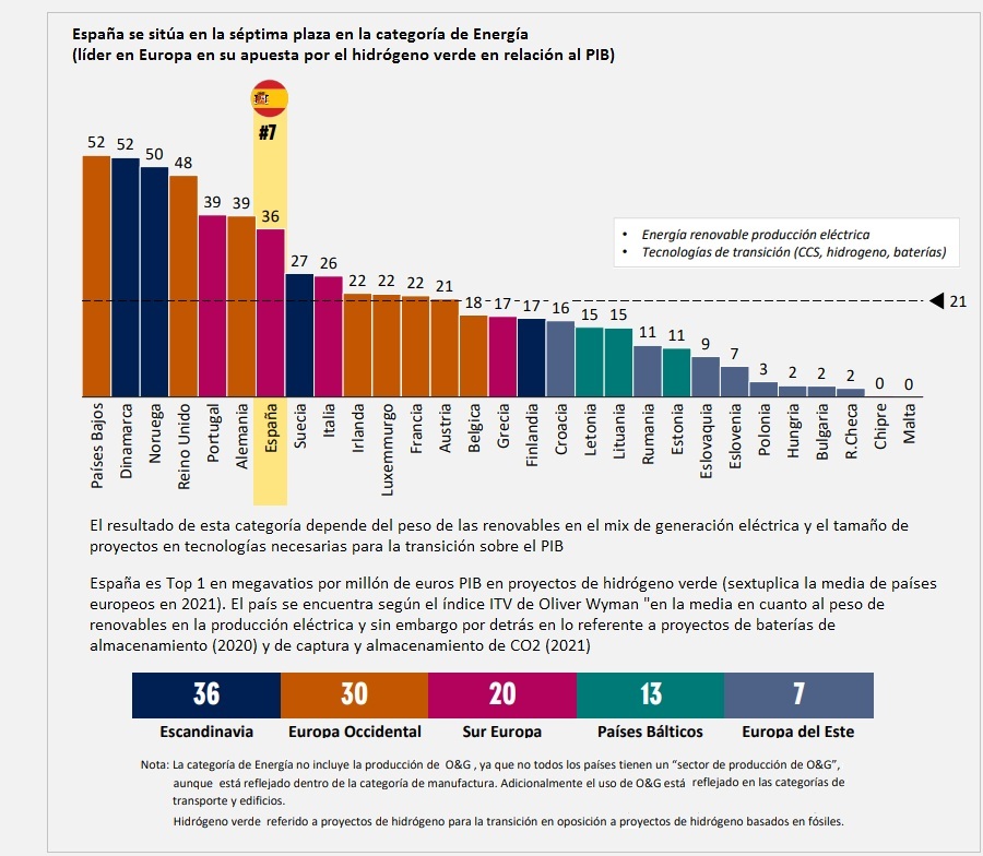 El Índice de Transición Verde (ITV) sitúa a España en la posición número 14 de 29, con una puntuación de 49,6 sobre 100, por detrás de países de su entorno como Francia o Italia. Sin embargo, y si bien es cierto que a España le queda aún "un largo camino por recorrer para alcanzar la sostenibilidad total, nuestro país -señala Oliver Wyman- destaca positivamente en las categorías de Economía (véase gráfico a la derecha) y Energía (más abajo, también a la derecha), donde registra las posiciones quinta y séptima, respectivamente.