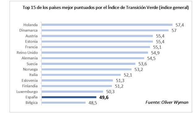 El Índice de Transición Verde de Oliver Wyman revela lo que califica como "una clara ventaja de los Países Bajos con respecto al resto de Europa en cuanto a su progreso en los ámbitos de la sostenibilidad y la reducción de emisiones". Países Bajos es líder indiscutible con una puntuación agregada de 57,4 sobre 100, registrando puntuaciones destacadas en todas las categorías y sobresaliendo especialmente en el campo de la gestión de residuos, gracias a sus esfuerzos en la implantación del reciclaje y su proporción per cápita de residuos depositados en vertederos.