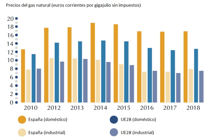 El otro dato clave del último Informe publicado por la Cátedra BP es el relativo a la dependencia. "La dependencia energética de España respecto del exterior -página 14- apenas muestra signos de mejoría y se mantiene en un 89%". El sector energético español consumió 6,25 exajulios (EJ) de energía primaria en 2018. Y el 89% de esos exajulios llegó de allende las fronteras. Y estamos hablando de una cantidad de recursos (energéticos y económicos) realmente formidable. Según la Secretaría de Estado de Comercio (Gobierno de España), nuestro país gastó más de 47.000 millones de euros (M€) en importaciones de productos energéticos en 2018. Enviamos al extranjero ese año 130 millones de euros, cada día, para comprar productos energéticos, productos que luego no empleamos tan eficientemente como nuestros vecinos. 130 millones de euros diarios "evadidos" que perjudican así la calidad de vida de las familias, que consiguientemente cuentan con menos recursos para abordar otros gastos, y que perjudican la competitividad de las empresas, porque es que resulta que, además, las empresas pagan aquí más caro el gas que en la UE28 (véase página 12).
