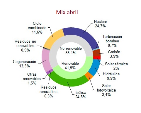 Ni los combustibles fósiles (carbón, derivados del petróleo y gas), ni la nuclear han producido tanta electricidad en España como las tecnologías renovables en el mes de abril. Según Red Eléctrica de España, operador del sistema eléctrico nacional, las fuentes limpias de energía –el sol, el agua, el viento...- han generado el 40,2% de la electricidad que ha demandado España durante el mes de abril. Más de un cuarenta por ciento de kilovatios hora limpios que se queda muy por encima de la generación fósil (31,8). A saber: las centrales de ciclo combinado (queman gas natural para producir electricidad) solo han generado el 14,6% de la electricidad de abril; la cogeneración (casi todo gas) se ha quedado en el 13,3; y el carbón no ha llegado siquiera al cuatro (3,9). ¿Total? El susodicho 31,8%.