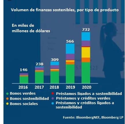 El estudio analiza la evolución de la financiación sostenible en los últimos cinco años, teniendo en cuenta bonos verdes, sostenibles y sociales, y préstamos y créditos verdes y ligados a la sostenibilidad. A nivel mundial, la financiación sostenible representó un volumen de casi dos billones de dólares en ese periodo, de los cuales 732.000 millones corresponden a 2020.