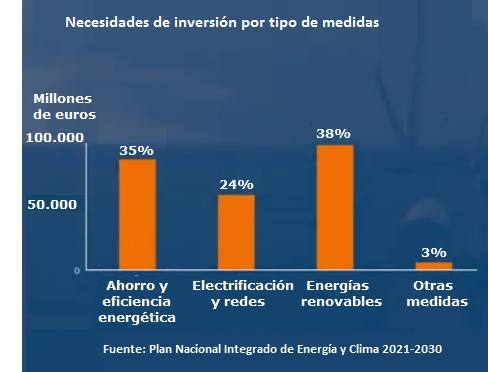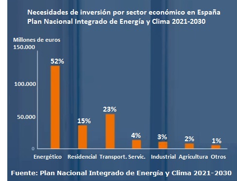 En esa onda, el Green Deal de la Comisión Europea prevé movilizar al menos un billón de euros de inversiones sostenibles durante la próxima década, y el Plan Nacional Integrado de Energía y Clima 2021-2030 cuantifica inversiones por valor de 241 miles de millones de euros.