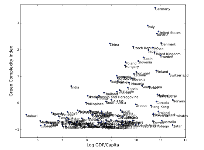 A partir de esta base de datos, los investigadores crearon una nueva medida: el Índice de Complejidad Verde, que muestra qué países son capaces de exportar los productos más ecológicos y complejos. Descubrieron que los países con un elevado PIB per cápita, como Alemania, Estados Unidos y Reino Unido, también tendían a menudo a clasificarse más alto en términos de su capacidad de producción ecológica. Sin embargo, otros países con un PIB elevado, en particular los que hacen hincapié en la extracción de combustibles fósiles, como Australia, Noruega y los Emiratos Árabes, mostraron un índice bajo. De acuerdo con los economistas de Oxford, esto pone de relieve la baja inversión actual en la producción ecológica e indica que el cambio a productos ecológicos podría ser difícil en el futuro.