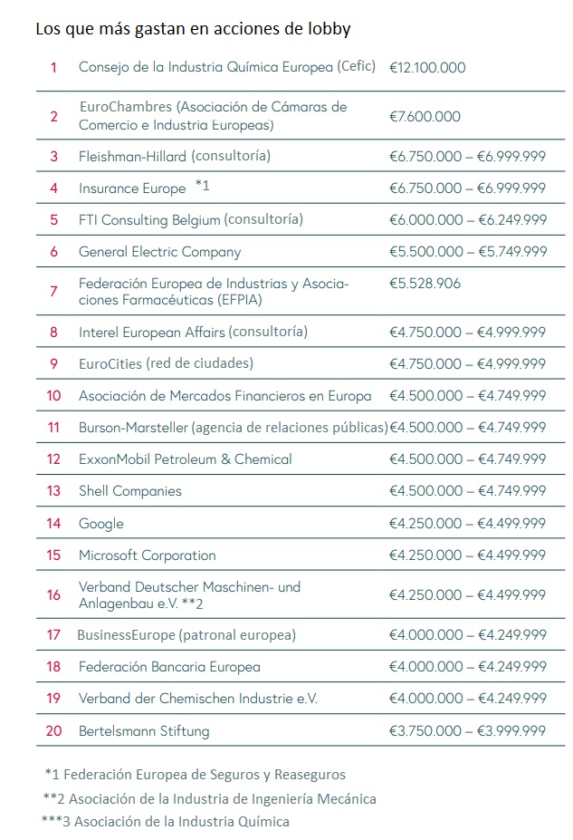 El informe presentado hoy, que ha sido elaborado por las oenegés Corporate Europe Observatory (CEO), OMAL-Paz con Dignidad y Ecologistas en Acción, asegura que actualmente hay más de 25.000 lobistas (profesionales contratados para influir en los eurodiputados) que trabajan en el barrio de las instituciones de Bruselas, y que están al servicio de grandes empresas y sus correspondientes grupos de presión. La guía repasa los tipos de lobby: grandes empresas; gurpos de presión del sector privado (asiociaciones empresariales, grupos multisectoriales); oenegés y sindicatos; consultorías especializadas en esta tarea; bufetes de abogados; y think tanks o laboratorios de ideas.