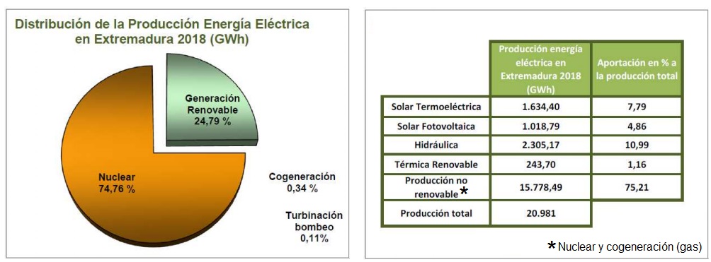 La producción de energía eléctrica en Extremadura tiene de base las tecnologías nuclear y renovable (hidráulica, solar y biomasa), a lo que se añade una pequeña aportación de la tecnología térmica no renovable (cogeneración) y turbinación de bombeo (turbinación de bombeo puro más estimación de turbinación de bombeo mixto). En el año 2018, la producción de energía eléctrica fue de 20.981 GWh, lo que supuso un aumento de un 0,9 % respecto a la registrada en el año 2017, que fue de 21.172 GWh, correspondiendo el mayor aporte a la nuclear, con 15.684 GWh. Le sigue a la nuclear la contribución de las energías renovables, que alcanzaron en 2018 los 5.202 GWh, lo que supuso un 24,79% del total de la producción.