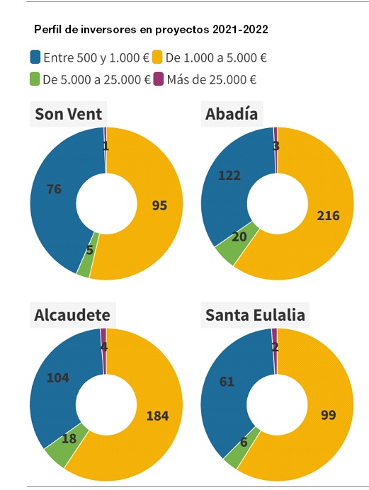 Ya en diciembre se lanzó el proyecto Santa Eulalia, en la Islas Baleares, con 4.800 kilovatios pico. Ha sido el primer parque fotovoltaico de toda España abierto a la participación local; los habitantes de la zona tuvieron prioridad a la hora de invertir. En apenas 45 días se lograron los 800.000 euros marcados como objetivo. En las próximas semanas se abrirán nuevas inversiones, como la del proyecto conjunto que incluye los parques de Son Sunyer y Les Andrevas, en Palma y San Llorenç, también en tierras mallorquinas. La potencia conjunta es de 9,6 megavatios pico y el objetivo de inversión se eleva a 1.623.596 euros.