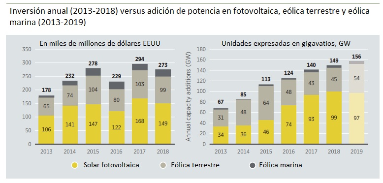 Enorme es el capital que los inversores del mundo han inyectado en el desarrollo de las energías renovables a lo largo de los últimos seis años (1 billón, 800 mil millones de dólares), pero insuficiente para materializar el compromiso climático más importante que ha asumido la humanidad: el Acuerdo de París, convenio multinacional (al que ahora por cierto volverá a adherirse Estados Unidos de la mano de su nuevo presidente) que compromete a las naciones de todo el mundo a evitar que la temperatura media global suba más de un grado y medio (con respecto a la media del período pre-industrial). Esa es la conclusión primera que han extraido Irena y el CPI de su informe Global Landscape of Renewable Energy Finance 2020. El estudio, que repasa el sexenio arriba señalado, muestra que la inversión en energías renovables cayó ligeramente en 2018, pero volvió a repuntar el año pasado (2019). La caída se debió en todo caso -matizan los autores del informe- a la caída de costes del sector: cada vez es más barato fabricar una placa solar o un aerogenerador, y cada vez es más barato instalarlos, por lo que la inversión en nuevos parques eólicos o fotovoltaicos es, así mismo, cada vez menor. Así se entiende por otro lado el hecho de que, aunque la inversión haya sido menor, la potencia instalada haya continuado creciendo.