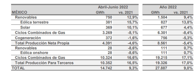 El brutal incremento de producción de energía eléctrica a partir de la quema de gas en las centrales de ciclo combinado de Iberdrola se produce además en un momento de también brutal escalada del precio de esta materia prima. El 18 de julio de 2021 el gas cotizaba a 35 euros el megavatio hora, mientras que hoy, 18 de julio de 2022, su precio supera los 100 euros (el precio del gas comenzó a escalar a principios de agosto del año pasado). El caso es que Iberdrola ha generado en España en este primer semestre de 2022 con gas natural y nuclear más electricidad (15.500 gigavatios hora) que la que ha producido en todas sus centrales de energías renovables juntas: eólica, gran hidráulica, minihidroeléctricas y solar fotovoltaica (11.870). [Bajo estas líneas, producción neta de electricidad de Iberdrola en México].