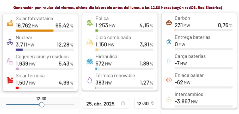 [Bajo estas líneas, reparto de la generación el viernes, último día laborable anterior al lunes del apagón. Como se aprecia en la imagen, la aportación renovable es muy similar y, sin embargo, no hubo problema alguno].