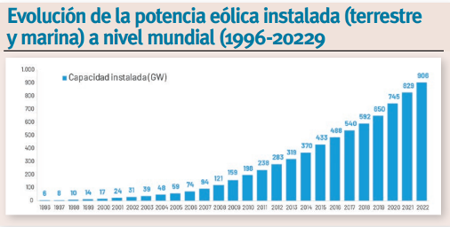 A finales de 2022, y según el Estudio Macroeconómico del Impacto del Sector Eólico en España de la Asociación Empresarial Eólica (AEE), la potencia eólica instalada a nivel mundial superaba ya los 906 GW gracias a que durante ese año se instalaron más de 77,5 GW eólicos (68,8 gigas de eólica terrestre y 8,7 de eólica marina), lo que supone un crecimiento del 9,3 %. En total, en 2022 la energía eólica alcanzó una generación de 2.105 TWh, el 50 % de la generación renovable y un 7 % de la generación total de electricidad. A pesar de que la eólica terrestre tiene unos datos mucho más elevados que la marina, ésta obtuvo en 2022 su segundo mejor año de la historia (tras un año 2021 de récord, con 19,8 GW nuevos). Como resultado la potencia eólica marina en operación alcanzó 64,3 GW. Una tecnología que se concentra principalmente en tres países que presentan un 83 % de la potencia instalada, siendo China el país líder con más de 31,4 GW de potencia instalada total (casi la mitad de la potencia eólica marina existente a nivel mundial).