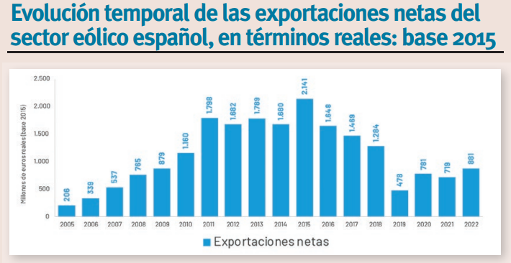 Asimismo, el sector eólico ha contribuido con 5.895,5 millones de euros al PIB español, de los que 4.012 millones de euros son contribución directa (datos prácticamente idénticos a los de 2021) y 1.883,4 millones de contribución indirecta (aumenta un 23 %). De este 2022 destaca la contribución directa del subsector Promotores-Productores, que ha alcanzado niveles máximos en los años 2021 y 2022, con 3.178,4 millones; o el subsector de Industria eólica offshore que ha crecido hasta los 138,6 millones. Sin embargo, en 2022 ha habido un fuerte descenso en el subsector de Fabricantes de equipos y componentes con 471,4 millones y otro en el de Empresas de servicios complementarios con 223,7 millones. En 2022, la actividad exportadora bruta alcanzó los 2.511,8 millones de euros, convirtiendo así a España en líder en la fabricación de torres eólicas marinas a nivel europeo (74 % de fabricación) y en el quinto país exportador bruto del mundo de aerogeneradores, por detrás de Alemania, Dinamarca, China e India. En cuanto a las exportaciones netas (diferencia entre exportaciones e importaciones), se alcanzaron los 881,3 millones, es decir, un incremento del 22,5 % respecto a 2021.