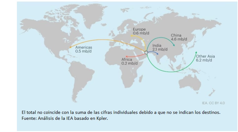 [Bajo estas líneas, a la derecha, exportaciones de petróleo crudo que transitan por el estrecho de Ormuz por destino, 2025. Fuente: Agencia Internacional de la Energía].