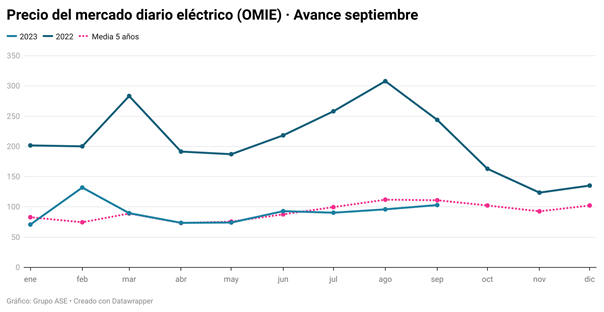 La subida del precio de la electricidad durante los primeros quince días de septimbre se debe a un fuerte descenso de la producción fotovoltaica (-23,84%) y de la eólica (-11,6%) respecto al mes pasado. Esto ha provocado que el precio medio de la electricidad del mercado mayorista se sitúe en los 103 euros por megavatio hora (MWh), es decir, un 7,37% más respecto a agosto pero un 57,7% más barato que hace un año. Además, el precio se ha incrementado un 15,03% en las horas de radiación solar. Sin embargo, señalan los analistas de Grupo ASE, durante la madrugada y el final del día se ha mantenido e, incluso, ha sido más bajo que el mes anterior.