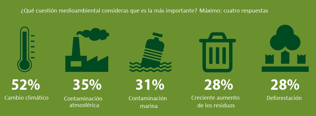 El Eurobarómetro también pregunta a los encuestados qué aspecto, dentro de los asuntos medioambientales, es "el más urgente". Pues bien, una mayoría de los encuestados (el 52%, que sube al 67% en España) considera que es el cambio climático, seguido por la contaminación atmosférica (35%), la contaminación marina (31%), la deforestación y el creciente aumento de los residuos (ambos con 28%).
