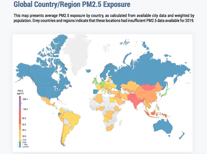 • India y Pakistan: en promedio, las ciudades indias superan en un 500% el objetivo de la OMS para la exposición anual a las PM2,5. No obstante, la contaminación atmosférica nacional disminuyó en un 20% entre 2018 y 2019, y el 98% de las ciudades experimentaron mejoras. Se cree que esas mejoras se deben, en gran medida, a la desaceleración económica.