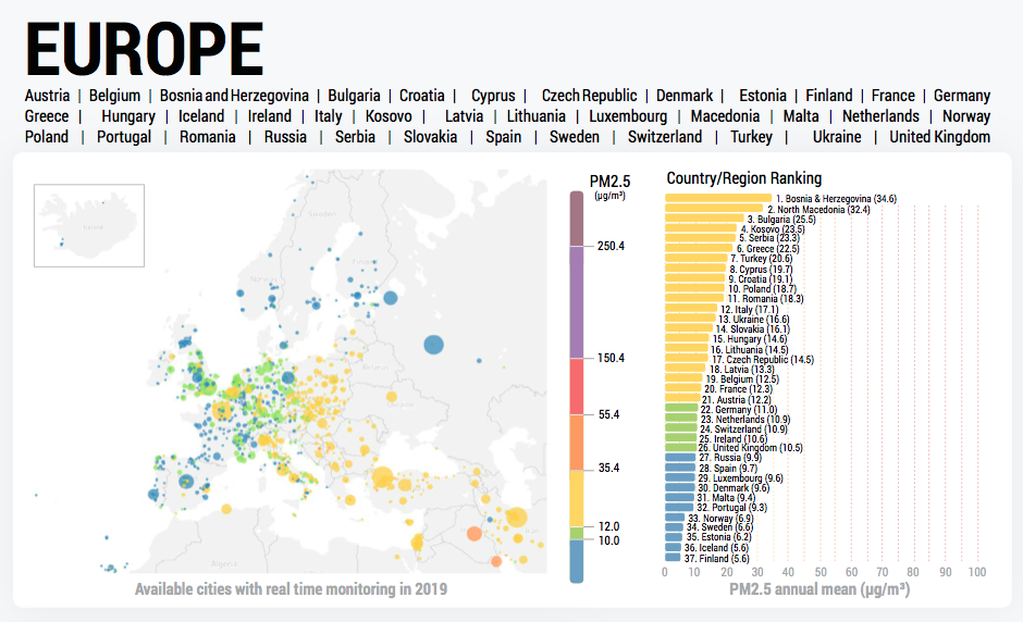 La contaminación en Europa por PM2,5 es menor. Y España se sitúa entre los mejores, sin que eso signifique que nuestras ciudades estén libres del problema. De los 92 países analizados en el informe, y teniendo en cuenta que el 92 es el que disfruta de una menor concentración de partículas (Bahamas, con 3.3 μg/m3), España ocupa el puesto 82 (9.7 μg/m3). Portugal, Noruega, Suecia, Estonia, Finlandia e Islandia son otros países europeos situados en los "mejores" puestos.
